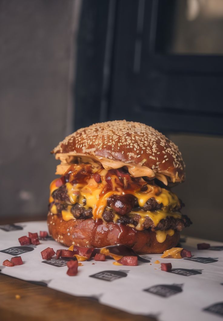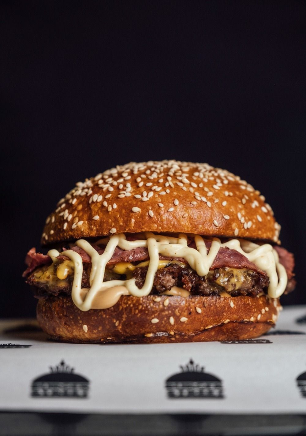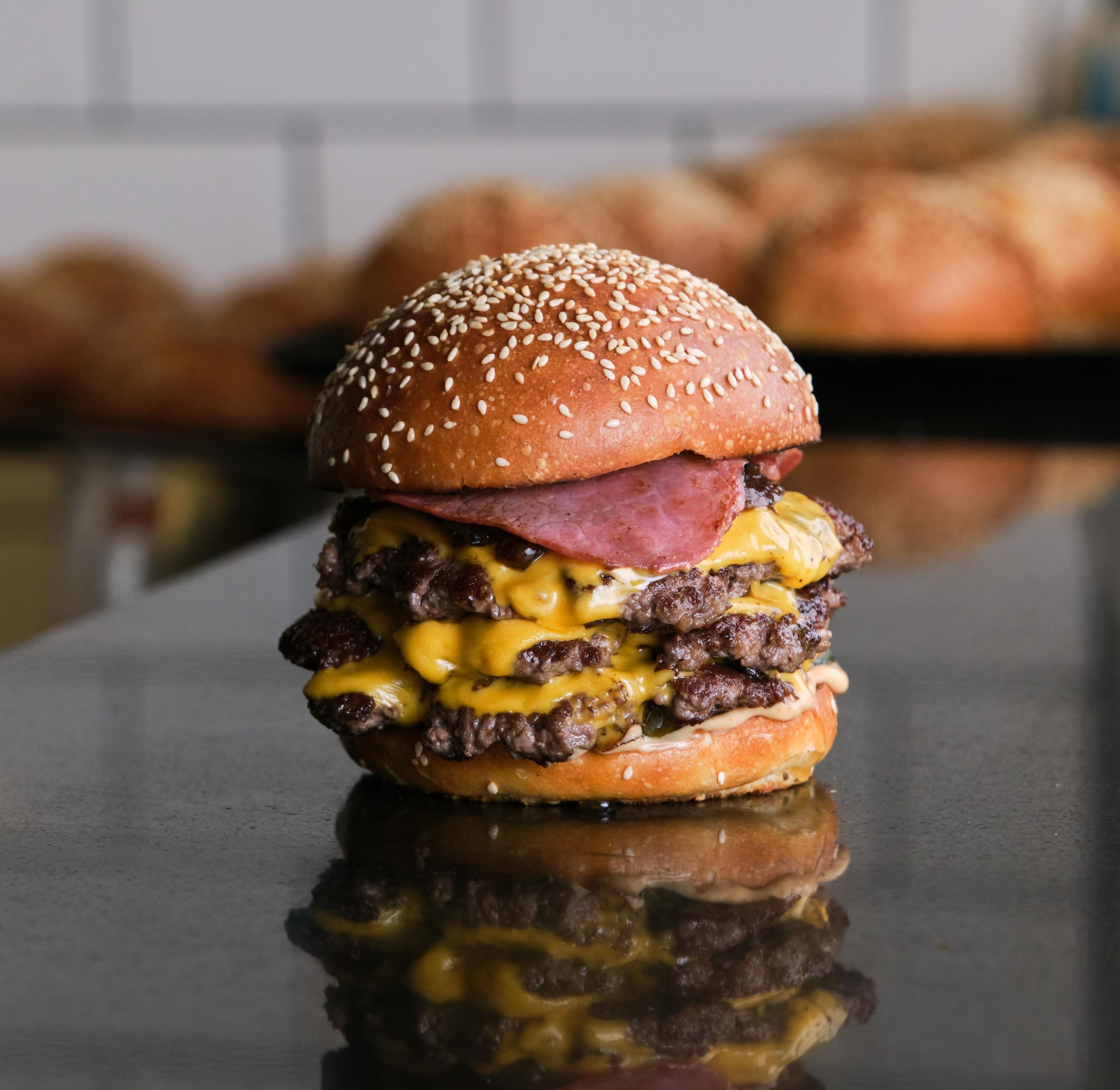 120 gr smash burger köftesi, kızarmış dana bacon,burger peyniri, çıtır soğan, turşu, bbq sosturşu,yerfıstığı ezmesi (Burger+Patates 585₺) (Burger+Patates+İçecek 645₺)