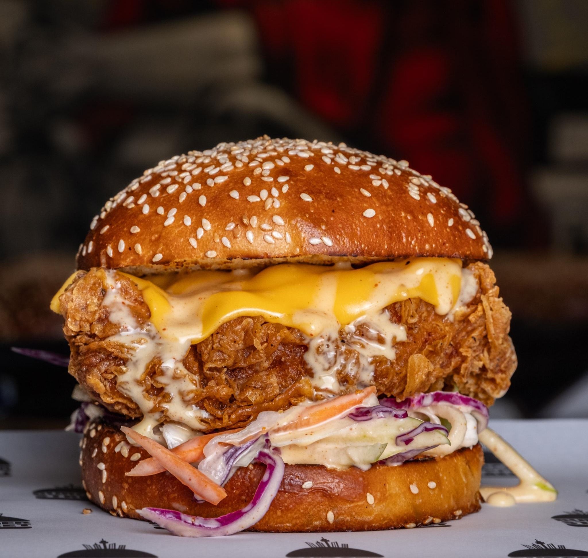 150 gr panelenmiş çıtır tavuk, sstreet coleslaw,cheddar peyniri, ballı hardal, acı sos (Burger+Patates 390₺) (Burger+Patates+İçecek 450₺)